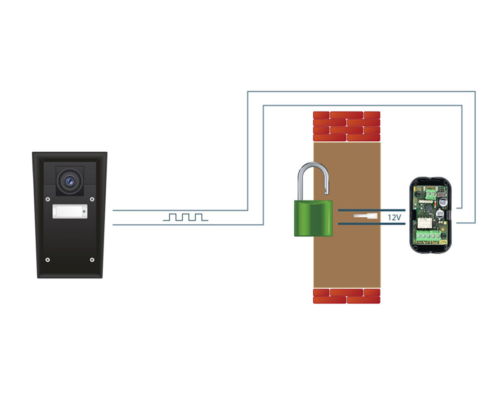 Das 2N EntryCom IP Security Relais ist eine Elektronikeinheit, die im geschützten Innenbereich montiert und über 2 Drähte mit der 2N EntryCom IP Türsprechstelle verbunden wird. Die maximale Kabellänge beträgt 10 Meter, die Kontrolle und Spannungsversorgung erfolgt ebenfalls über die 2N EntryCom IP Türsprechstelle. Empfängt die 2N EntryCom IP das Kommando zur Türöffnung, entweder über die DTMF Eingabe des Türöffnercodes während eines Gespräches, per http-Request oder Codeeingabe über die Tastatur, wird eine codierte digitale Message über die Zweidrahtverbindung an das Security Relais gesendet und der Türöffnerkontakt ausgelöst. Eine Manipulation durch Kurzschluss oder eine externe Spannungsquelle ist damit ausgeschlossen.